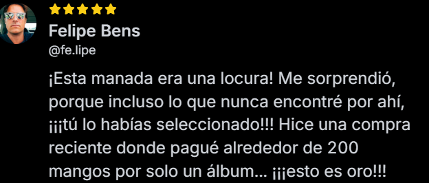 Es una gran suerte, porque escuchar música online hoy en día es caro y lo sabes muy bien, y lo que hoy te ofrecemos aquí tomó años y noches de búsqueda, compromiso, esfuerzo, contacto, productores, bandas, en fin, mucha lucha para armar una colección tan impecable como esta, que podrás tener en unos minutos y descargar con un solo clic para tener acceso de por vida.